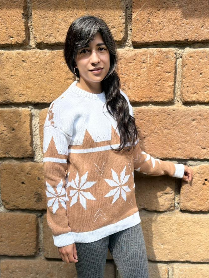 A cozy sweater inspired by the gentle beauty of the poinsettia in winter. Frosted Bloom brings a touch of festive charm through its delicate floral motif and soft, comfortable feel.  It’s a timeless piece that adds warmth, color, and a subtle holiday spirit to any wardrobe.